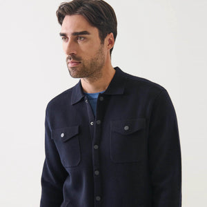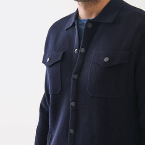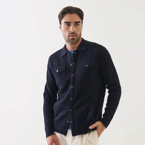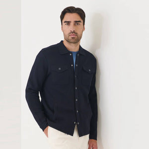 The snap front overshirt is crafted from premium extra-fine merino wool in a classic Half-Milano stitch. This overshirt offers rich texture, exceptional softness, and a polished finish. With its snap-front closure and relaxed yet tailored silhouette, it transitions seamlessly from casual to smart dressing, making it perfect for transitional seasons and versatile layering.